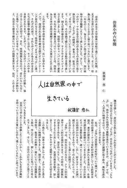 という直筆のメッセージと署名や、「お茶小の六年間」と題した作文を公開。