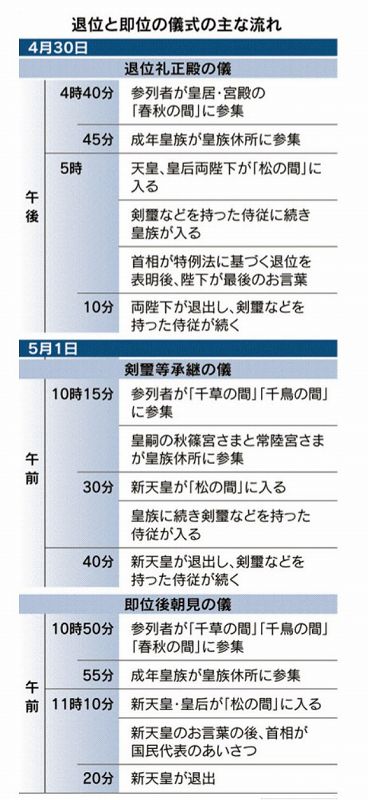 新天皇への「剣璽等承継の儀」は5月1日午前10時半から行い、三権の長や閣僚ら