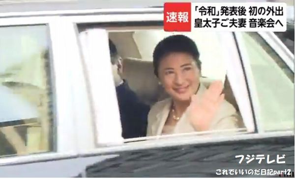 雅子さまと共に元号発表後、初めて外出し、車の窓を開け、笑顔で手を振られた。