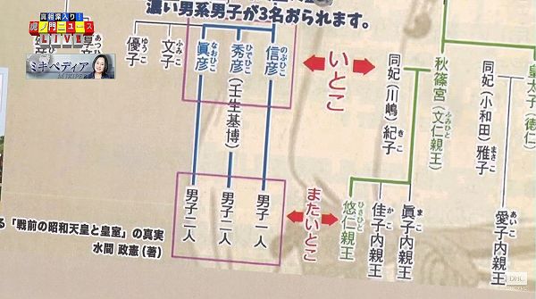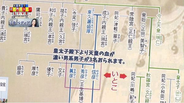 同じく、昭和天皇も東久邇宮家との婚姻を進めた。東久邇宮盛厚王(終戦時の稔彦首相の息子)と昭和天皇の皇女である成子内親王はご結婚され、その子が最近お亡くなりになられた信彦氏である。大塚氏が問いただしているのは、信彦氏に子女がいるではないか、との事実だ。信彦氏の母は、今上天皇の姉上にあたる。また祖父母全員が皇族である。(母方の祖父は昭和天皇)。