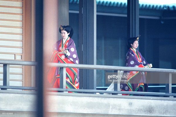 女性皇族はおすべらかしに唐衣裳装束で正殿松の間までそろそろと歩きます。