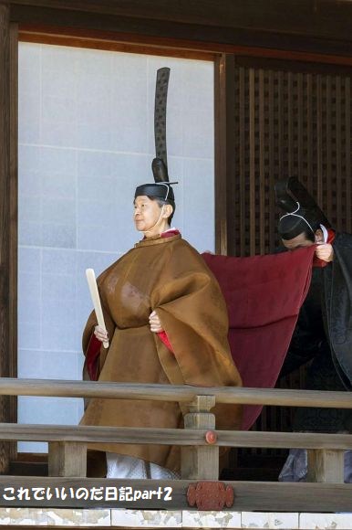 陛下は「黄櫨染御袍(こうろぜんのごほう)」という天皇専用の装束を初めて着た。