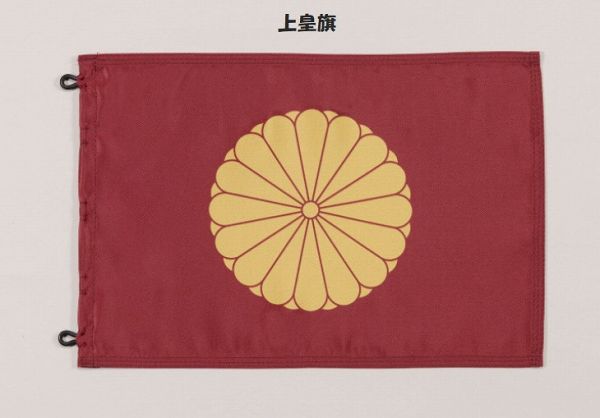 菊の紋章があしらわれ、地の赤色は天皇旗よりも濃いデザイン。