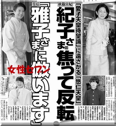 女性セブンは「美智子様御用達雑誌」と昔から言われていますが、それが本当なら、美智子様ご自身が雅子様応援、紀子様ディスリに加担していると言われても仕方がないぐらいひどい記事です。