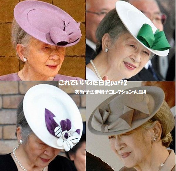 目の調子がお悪いところ、記事の更新ありがとうございました。美智子様の皿帽子、妙ちきりんだと思っていたのですが、こうやって並べて拝見すると、大皿帽子はどれも素敵ですね。おまるの帽子よりいいかもしれません。小皿帽子も素敵なのだと思うこともありますが、あの紐(ゴム?)がいけませんね。