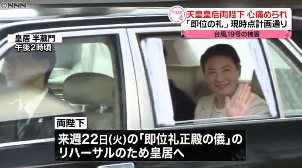 状態で大変なことになってしまいましたねぇ(>_<) 私も台風被害もなくこうして過ごしていますが、 リハーサルに行くときまでお手振りの必要があるでしょうか。 軽く会釈でよかったのでは、と思いました。 今回はお見舞いが遅いのに、お祝い事の即位関連行事が近い。 被害はどんどん大きくなっていった、タイミングが悪いですよね。 言葉だけが空回りしている感じがしてしまいます。 美智子さまの誕生日行事取り止めなど発表する必要があったのかしら。 ここの所、メディア露出も少なくてそろそろ出て来たくなった、 慈愛の美智子さまアピールしたくなったきた?