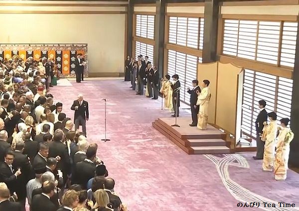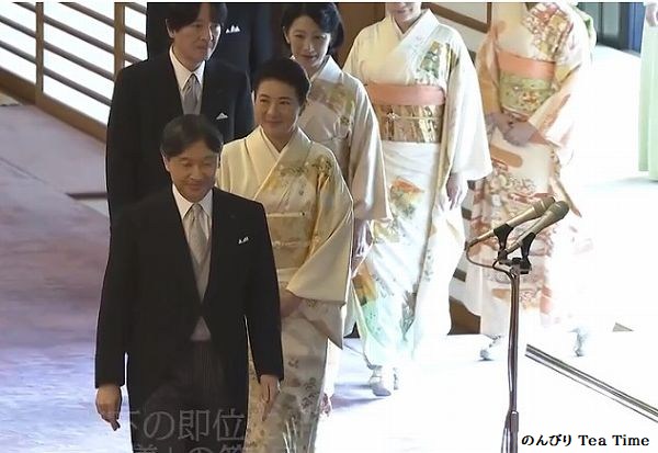 天皇皇后両陛下、秋篠宮ご夫妻、眞子さま、佳子さま、華子さまが入場。華子さまは杖をついていました。よく即位礼正殿の儀で十二単で45~50分も微動だにせず立たれていたと感嘆しました。照明の関係で皆様がお召しになった正確な着物の色はわかりませんが、紀子さま、華子さまの着物良いですね。以上の画像は毎日新聞の宮内庁提供の動画より