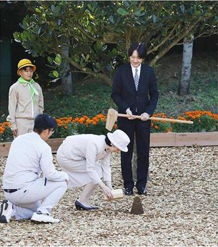 沖縄県平和創造の森公園で、肥料を与えられる秋篠宮ご夫妻=14日午後、沖縄県糸満市