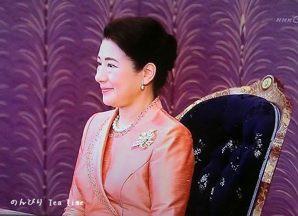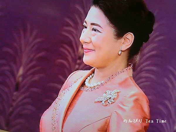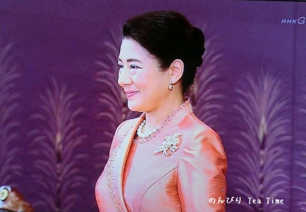 雅子さまのご様子、報道ステーションで映像を見ました。お召し物は、随分と凝った細工もあり、色合いも鮮やかで良かったと思います。雅子さま、細くはないですが、ご年齢を考えると、ふくよかでおおらかな感じがしますし、良いのではないでしょうか。