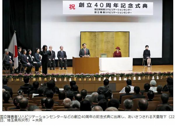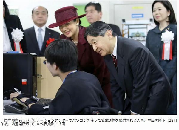 天皇、皇后両陛下は22日午後、埼玉県所沢市の国立障害者リハビリテーションセンターで行われた同センターなどの創立40周年記念式典に出席し、入所者の就労支援の様子を視察された。天皇陛下は式典で、「障害の有無にかかわらず、誰もが相互に人格や個性を尊重し支え合う『共生社会』が築かれていくことを切に願っています」とあいさつした。両陛下は続いてセンターの就労支援室を訪れ、さまざまな身体障害を持つ入所者がパソコンの入力作業を練習する様子を見学。天皇陛下は「作業はいかがですか」「どういうことが難しいですか」と一人一人に尋ね、体調を気遣っていた。記事出典 時事通信 https://www.jiji.com/jc/article?k=2020012200946&g=ryl