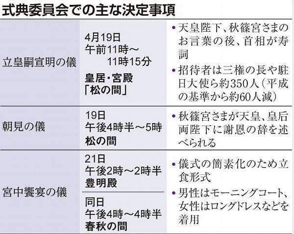 4月19日に「立皇嗣の礼」、4月21日に「宮中饗宴の儀」を開催。