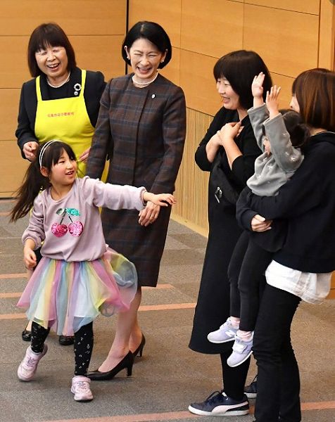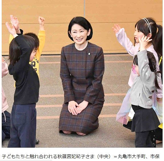 秋篠宮妃紀子さまは14日、子育て支援や母子の健康づくりに取り組んでいる県母子愛育連合会の活動を視察するため来県された。丸亀市大手町の市保健福祉センターを訪問し、県内の活動状況の説明に耳を傾け、親子体操の様子を笑みをたたえて見守った。紀子さまは恩賜財団母子愛育会(東京)の総裁を務め、地域組織の活動を視察している。来県は綾川町で行われた主基斎田100周年記念式典への出席以来、5年ぶり4回目。紀子さまは東かがわ市や小豆島町など県内5市町の母子愛育会の会長らから、それぞれの活動内容を紹介する写真入りパネルの前で説明を受けた。興味深そうに写真を見て質問し、一人一人の話をうなずきながら聞いていた。この後、丸亀市の0~6歳の子どもと親の15組37人の体操や表現遊びを見学。市のマスコットキャラクター「とり奉行 骨付じゅうじゅう」の着ぐるみと一緒に踊った子どもたちに拍手を送り、音楽に合わせた親子体操では一緒に体を動かした。