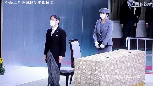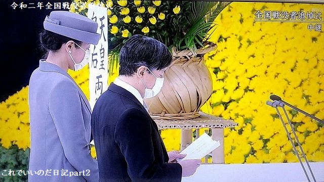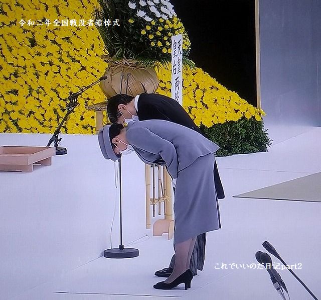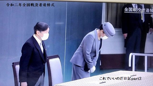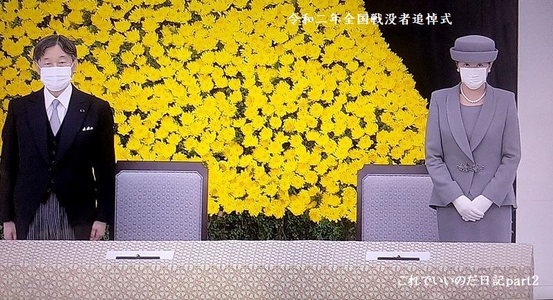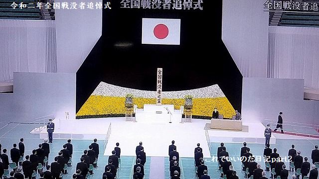 令和2年全国戦没者追悼式の生中継を観ました。今年は新型コロナの影響で参加者を減らした追悼式でした。席は間隔を取り全員マスク使用、国歌も演奏だけでしたが、静かに式典が行われました。安倍総理はお疲れじゃないかと思いました。