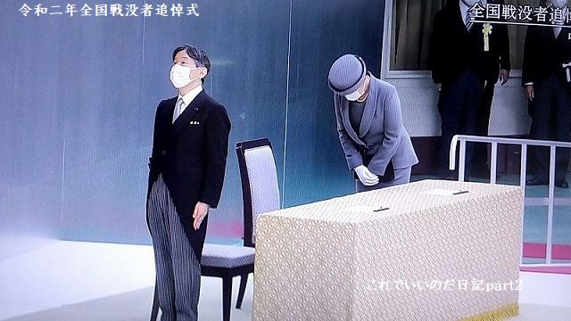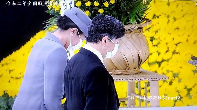 「過去を顧み、深い反省の上に立って」の言葉だけ捉えると、戦後75年経ってもまだ反省しなければならないのか!と思ってしまいそうですが、その後に「再び戦争の惨禍が繰り返されぬことを切に願い、戦陣に散り戦禍に倒れた人々に対し、全国民と共に、心から追悼の意を表し」と続くので、追悼式なので良いかなと。私は総じて良いお言葉だったと思うのは、上皇陛下が言うのと、今上陛下が言うのでは時代が変わり捉え方も変わったのかなぁ~なんて1人で思いました。NHKの生中継は短かったので、その後youtubeで生中継を観ました。献花の前に天皇皇后両陛下は退席で約45分~50分くらい、一時間は座っていなかったようでした。
