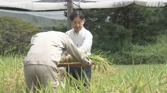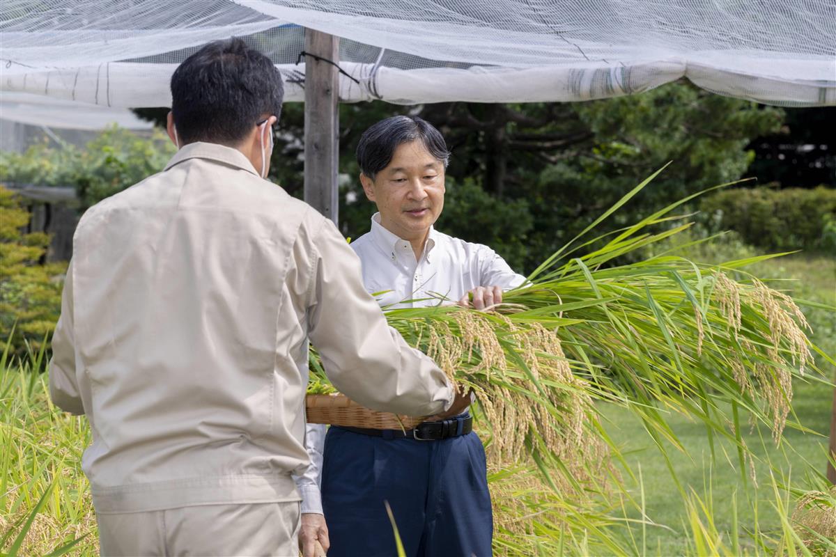 天皇陛下は15日、皇居内の生物学研究所脇の水田で、稲刈りをされた。陛下は長袖の白いシャツに紺色のズボン、長靴姿で、鎌を手に腰をかがめ、5月に自ら田植えをしたもち米の「マンゲツモチ」と、うるち米の「ニホンマサリ」計20株を手際よく刈り取られた。皇居の稲作は昭和天皇が始めた恒例行事。陛下は昨年、上皇さまがまかれた種もみの苗を植えるところから稲作を引き継いだが、種もみまきから一連の行事に携わられたのは今年が初めて。陛下はこの日、宮内庁を通じ、「稲作への思いをより深めることができました」との感想を文書でご公表。また、豪雨被害や新型コロナウイルスの感染拡大下で農業に従事する人たちに思いを寄せ、「各地で収穫が無事に行われることを願っております」とつづられた。