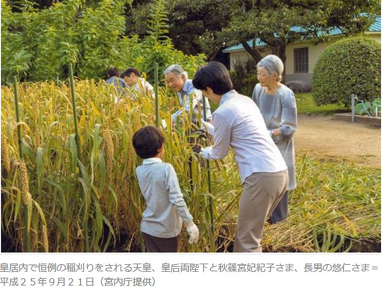 天皇陛下が稲刈りをされることによって、農家の収穫が無事行われることを祈ります。