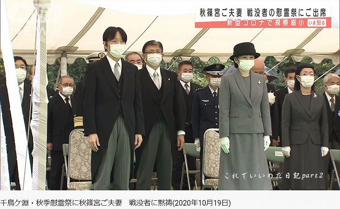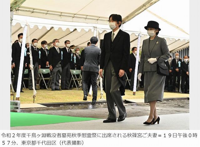 秋篠宮ご夫妻は19日午後、東京都千代田区の千鳥ケ淵戦没者墓苑で開かれた秋季慰霊祭(同墓苑奉仕会主催)に参列された。同墓苑は太平洋戦争中に戦死したり、抑留中に死亡したりした身元不明の戦没者を慰霊するため国が1959年に建設。36万9856柱の遺骨が安置されている。ご夫妻が拝礼した後、参列者が献花し、戦没者の冥福を祈った。新型コロナウイルス対策として全員がマスクを着用した。記事・画像出典 時事通信https://www.jiji.com/jc/article?k=2020101900711&g=ryl