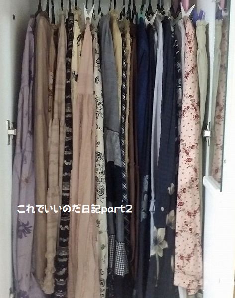 捨てる前のスカートを吊るしておいたタンスの中。凄いです、ギチギチと満員電車、乗車率150%の状態。この他にも吊るしてあるスカートと畳んで保管したスカートが沢山ありましたが、恥ずかしくて見せられません(*_*;