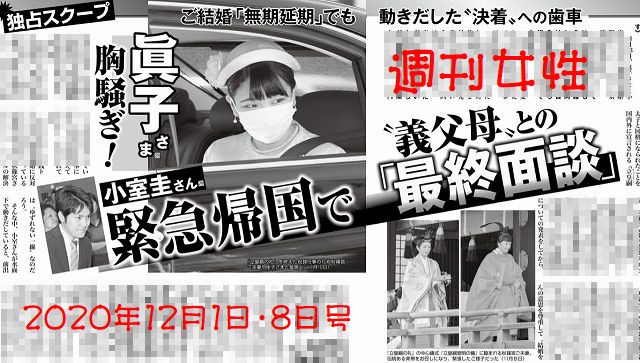 まだ今週号が発売されていないので、眞子さんが出した文書絡みで今週号に載せる予定の記事を早くネットに載せたのかな~?と思いました。「女性自身」2020年12月1日・8日合併号 掲載となっています。