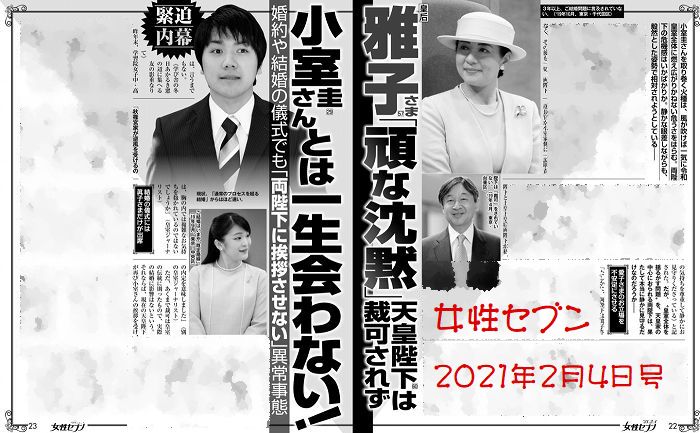 他に女性セブンは眞子さんと小室Kの事に絡めた、天皇皇后夫妻雅子のことも書かれていました。眞子さんと小室Kが結婚したら・・・の仮定の記事で、小室圭さんとは一生会わない、どころか結婚されるのは嫌なのですが。