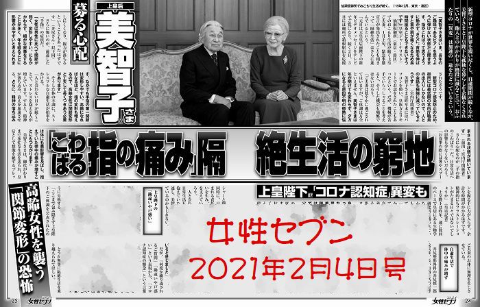 早く東宮御所に引っ越ししたくてたまらないのでしょうね。「欲」というものは、これで満足にならない、次から次へと欲が出て、それが「強いお気持ち」で簡単に叶ってしまう立場なので、キリがないようです。 ところが、その欲も中国武漢ウィルスには勝てず、思い通りの「引退後の生活」にはならなかったようで、こうしてグチグチと美智子さま御用達の女性セブンに書かせているのか?  セブンが気にかけて書いてやっているのか。