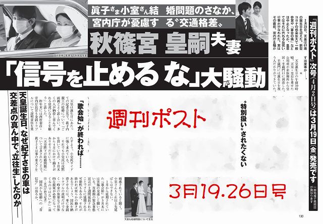 秋篠宮さまは“公費支出を抑えたい”“多くの人に迷惑をかけたくない”というご希望が強い、そのため専用機の使用や信号を止めることに否定的なのです。しかし、それがかえって周囲の手間を増やしてしまう結果になっていることは否めません(週刊ポストより引用)