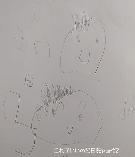 上の孫が家で書いた「おじいさん上とおばあさん下」の絵。4才8カ月でこんな感じ。左利きで、自分の下の名前だけは書いていました。