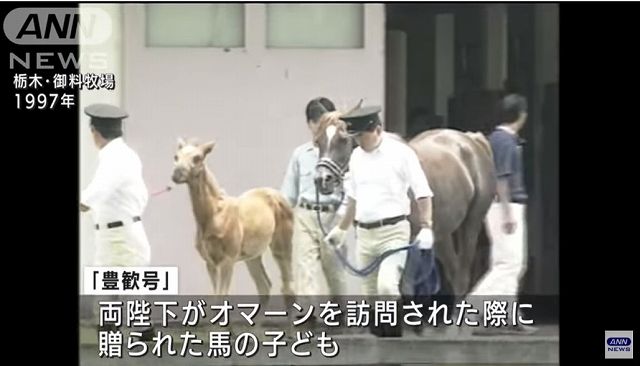 天皇、皇后両陛下の長女、敬宮(としのみや)愛子さまは6日、宮内庁車馬課の厩舎(きゅうしゃ)で飼育されている牡馬「豊歓(とよよし)号」と対面するため、皇居を訪問された。豊歓号は、両陛下が平成6年にオマーンを訪問した際、同国王から贈られた牝馬「アハージージュ号」の子供で、9年に誕生。愛子さまは幼少期、乗馬などでたびたび触れ合われていたという。高齢となった豊歓号が近く、御料牧場(栃木県高根沢町)へ移送されることから、お別れのあいさつを希望された。宮内庁によると、皇后さまも付き添われたという。
