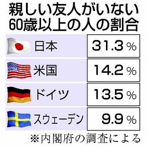 共同通信の記事では60才以上の人の割合なのと、国民性があるので親しい友達の線引きが分かりませんが、60才以上の日本人は親しい友達がいない人が3割とのことでした。