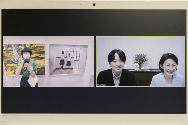 「第45回全国高校総合文化祭(総文祭)」の参加者らとオンラインで交流された。ご夫妻は英語劇の発表や絵画、彫刻などの作品展示をライブ中継でご鑑賞。その後、出演・制作者や、大会の実行委員の生徒らと画面越しに懇談された。