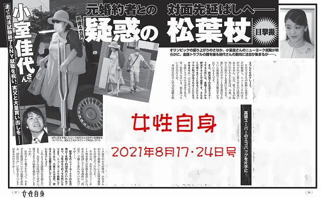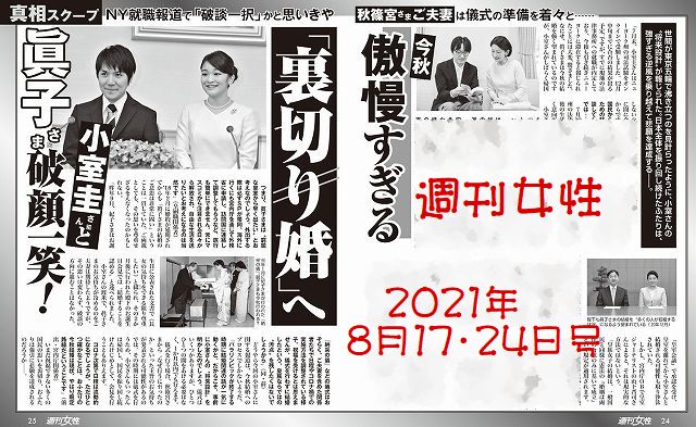 「パラリンピックが終了する時期に結婚関連の話が一気に動くかと。だからこそ、事前に小室さんの“将来設計”を明かしたのでしょう。儀式はいくつかありますが、ひとつひとつの間をあける必要はなく、1か月以内でも行えます。儀式を行う場合、秋篠宮さまから“なぜ行うに至ったのか”といった主旨のお気持ちが発表される可能性があるのでは。その時期には儀式を行うため、小室さんもいったんは帰国し、国民を振り回し続けたけじめとして、会見を行うこともありえます。コロナ次第で日程は流動的になるでしょうが、ただひとつ確かなことは、おふたりの今秋結婚は現状、やはり既定路線だということです」(前出・宮内庁関係者)記事出典 週刊女性