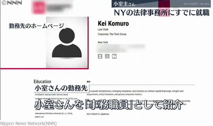 小室さんの勤務先は全米に5か所の拠点をもち350人以上の弁護士が所属する大手法律事務所です。事務所のホームページには弁護士資格がまだない小室さんを事務職員として紹介し、投資家や新興企業にアドバイスを行うとしています。