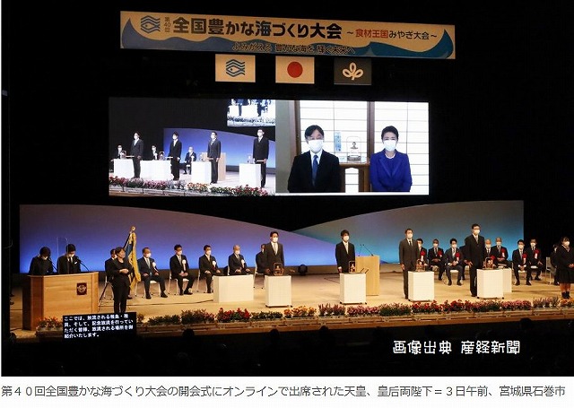 天皇、皇后両陛下は3日、東日本大震災の被災地、宮城県石巻市で開催の第40回全国豊かな海づくり大会の式典に、皇居・御所からオンラインで出席された。新型コロナウイルス禍を考慮した対応。天皇陛下は、会場の大型モニターを通じ「震災を乗り越えて大会が開催されることは誠に意義深く、復興に向けた地域の人々の、これまでのたゆみない努力と関係者の尽力に深く敬意を表します」と述べられた。コロナ禍で苦労する水産業者へのねぎらいの言葉も掛けられた。当初は昨年9月に開催予定だったが、コロナ禍で延期となっていた。午後の式後には、震災10年となった被災者と画面越しに懇談される。海づくり大会は、全国植樹祭、国民文化祭、国体とともに「四大行幸啓」と呼ばれる主要な地方のご公務。記事出典 産経新聞 https://www.sankei.com/article/20211003-KHEH3H5YDZOGFPL4DIA3S2TI7Y/