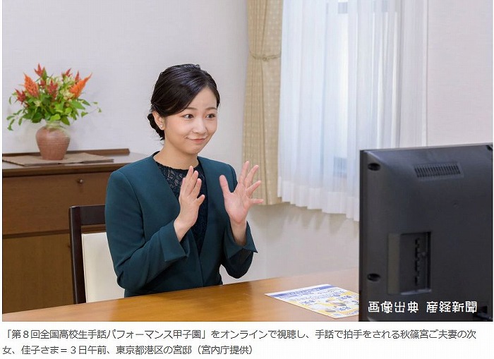佳子さまがオンラインで「高校生手話競技会」にメッセージを寄せられました。佳子さまも早いもので26才、誕生日の12月29日には27才になります。 眞子さんの次はそろそろ佳子さまの結婚の話が出てくるかもしれませんが、秋篠宮家では眞子さんの反省を踏まえて佳子さまのお相手はかなり厳重に調べ、国民の納得と祝福を得られる結婚にしなければならないです。