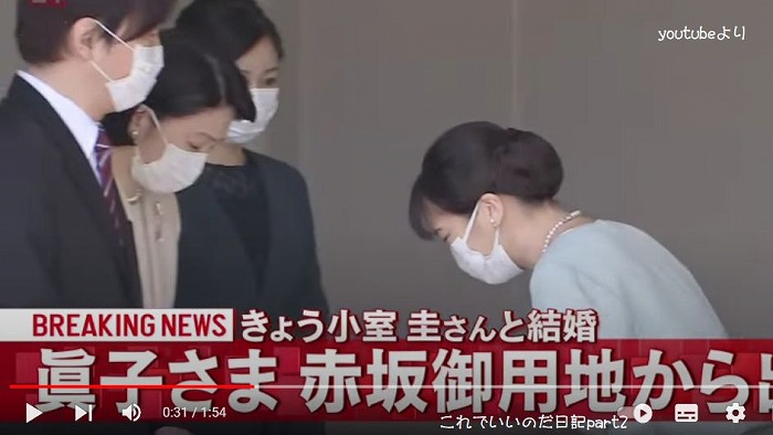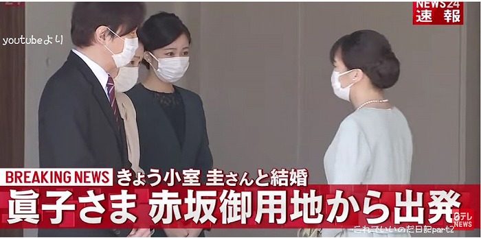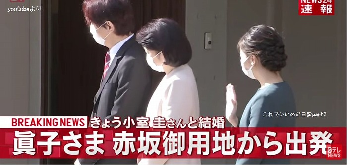 CSで日テレNEWS24を見ていたら、眞子さん婚姻届け受理の速報と宮邸を出る映像が流れました。とうとう小室圭と結婚し「小室眞子さん」になってしまいました。