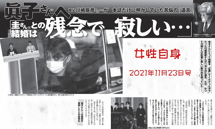 例えば、秋篠宮殿下が納采の義を行うと判断したら、小室家では使者は誰にお願いするのか、納采の義の品は自腹で揃えられたのだろうか、 圭氏のモーニングは、圭与さんの着物は自腹で用意できたのか? 納采の義の無い結婚は小室家にとって良かっただけでした。 眞子さんも秋篠宮家から追い出されたようでもない、祖父が亡くなられたから秋篠宮邸へ頻繁に行くことが出来たのか。11月5日は10時間も滞在し食事も一緒にしたとは、今まで両親と口も聞かない状態を続け両親を随分と悩ませたのにね。 嘘か本当か分かりませんがそんな女性自身の記事でした。