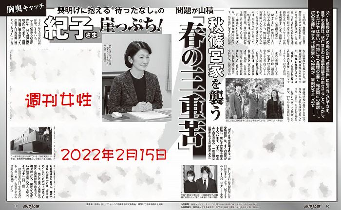 本来は秋篠宮家全員の問題なのに、今週の週刊女性は「紀子さま崖っぷち!」秋篠宮家を襲う「春の三重苦」のタイトル。