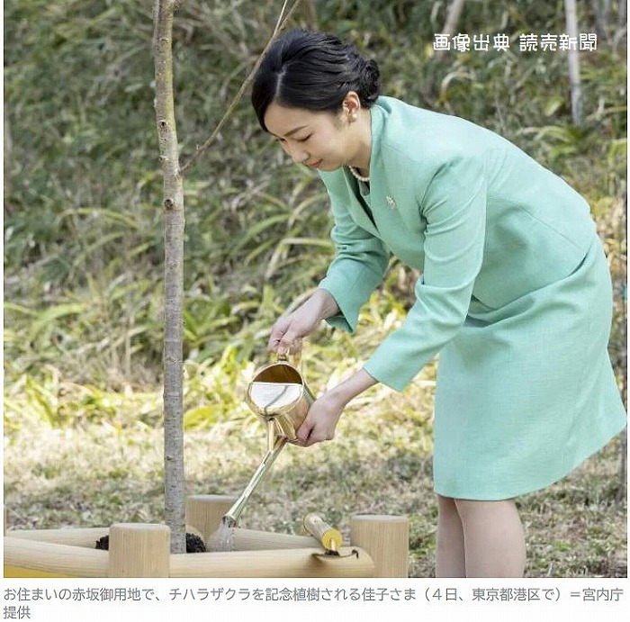 また、平成28年の熊本地震と令和2年7月豪雨による被害に触れ、「多くの困難がある中、復旧・復興の歩みを続けていらっしゃる皆様に、心から敬意を表します」と語りかけられた。終了後には、佳子さまがオンラインで、緑化活動に貢献した関係者と懇談される時間も設けられた。行事は代替わりに伴い、秋篠宮ご夫妻から長女の小室眞子さんに引き継がれていた。佳子さまのご臨席は初めて。記事出典 産経新聞https://www.sankei.com/article/20220330-XGOL46HS6RMCRCHU3UUXV4CM3A/