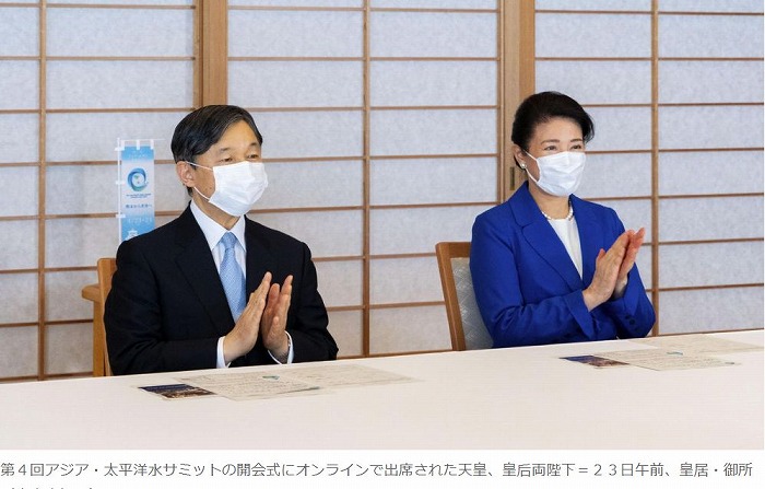 評判の良い天皇皇后夫妻は23日に熊本市で開催された第4回アジア・太平洋水サミットの開会式にオンラインでご臨席。天皇陛下がマスクを外して英語でお言葉を述べられました。