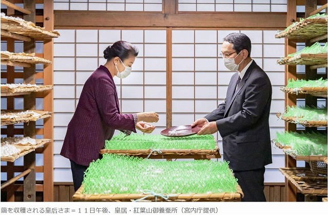 皇后さまは11日、皇居内にある紅葉山御養蚕所で、今年初めて蚕の繭を収穫する「初繭掻(か)き」に臨まれた。皇后さまは蚕が繭を作る「蔟(まぶし)」と呼ばれるプラスチック製の網に手を入れ、丁寧に繭を取り出された。養蚕を手伝う担当者が、湿度が高く気温の変化が激しい最近の気候について説明すると、皇后さまは「こういう環境で飼育するのは大変でしょう」とねぎらい、蚕が順調に育っていることを喜ばれていたという。記事・画像出典 産経新聞