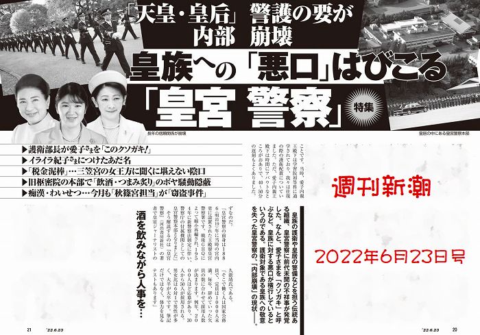 週刊新潮ですが、どうしたのでしょう。「皇族の護衛や皇居の警備などを担う伝統ある組織、皇宮警察に前代未聞の不祥事が発覚した。なんと、愛子さまをクソガキと呼ぶなど、皇族に対する悪口が横行しているというのである」