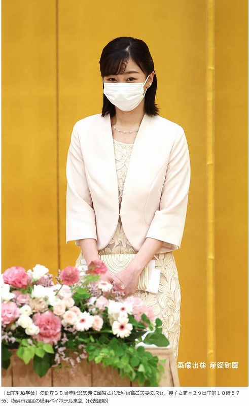 秋篠宮ご夫妻の次女、佳子さまは29日、横浜市の横浜ベイホテル東急を訪れ、「日本乳癌(にゅうがん)学会」の創立30周年記念式典に臨席された。佳子さまは式典でのお言葉で、「乳がんは多くの人の人生に影響を及ぼしており、たいへんな思いをしている方々がいらっしゃいます」とご指摘。「医療が患者さんに寄り添いながら一層進歩するとともに、乳がんに対する社会全体の理解が深まること」を願われた。記事・画像出典 産経新聞https://www.sankei.com/article/20220629-MQVMK2DSYRO7NGRPEXKJG5R6OQ/