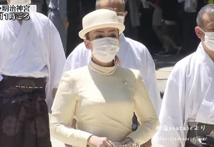 今日の明治神宮参拝はテレビで見ました。拝礼の時に気づいたのですが、ロングドレスの下にウェディングドレスで着るようなコルセットをしているように見えました。胸のラインや背中など綺麗に見えます。