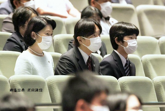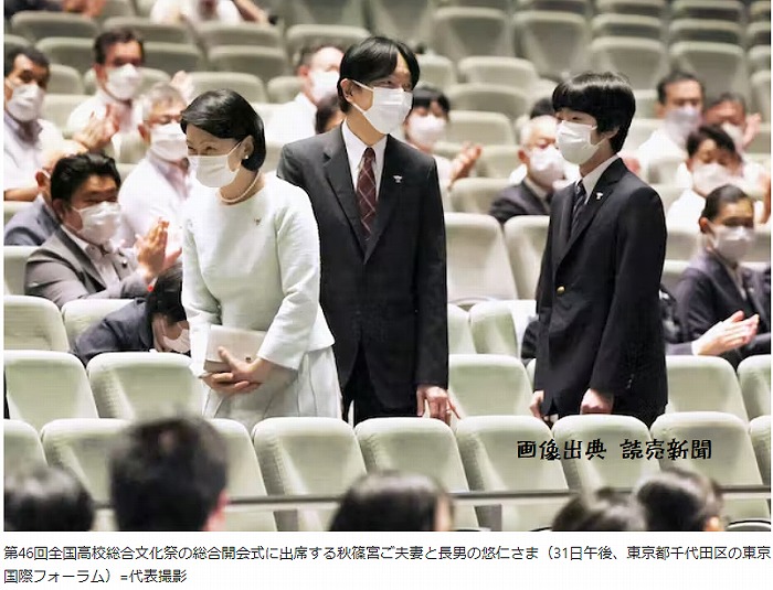 秋篠宮ご夫妻と長男悠仁さまは31日、東京都千代田区で開かれた全国高校総合文化祭の総合開会式に出席された。新型コロナウイルスの影響で、ご夫妻が式典に直接参加するのは3年ぶり。秋篠宮さまは「感染症への対応に十分心を配られつつ、参加者相互の交流を深め、友好の輪を広げていかれることを願っております」とあいさつ。悠仁さまも観客席から、高校生によるミュージカルなどに拍手を送った。悠仁さまは筑波大付属高校(文京区)1年生で夏休み中。式典などへの出席は、2019年12月に姉の佳子さまと訪れた、都内で開催された「少年の主張全国大会」以来となった。ご夫妻と悠仁さまは期間中、各会場を訪れ合唱などを鑑賞する予定。