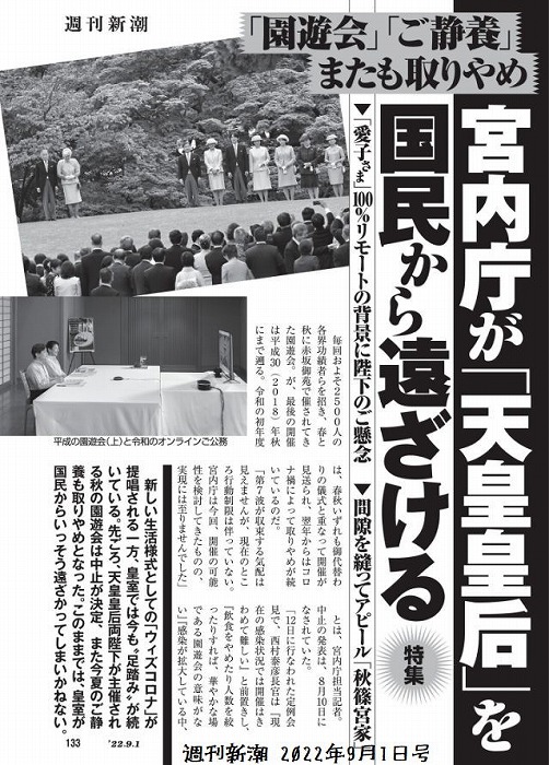 週刊新潮のタイトル「宮内庁が天皇皇后を国民から遠ざける」ですが、宮内庁の責任ではなく、天皇陛下が言葉だけ「国民に寄り添う」を使い、コロナ禍を大いに利用し国民から遠ざかっているとしか思えないのですが。