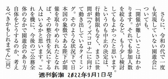 ざーーっと読むと、「園遊会」「ご静養」が今年も取りやめで、どーーしてもコロナに感染したくない、皇室がコロナの感染源になってはならないという強い思いが天皇陛下にはあり、その強いご意思により取りやめになった、ということでした。