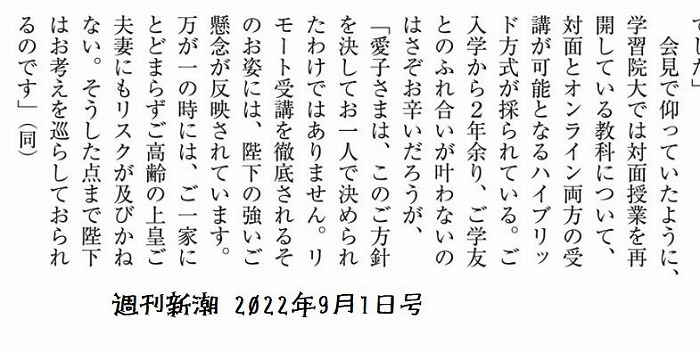 大学も入学以来一度も対面授業を受けられていない。これも愛子さの1人で決められたことではなく、天皇陛下の強いご懸念が反映されている。