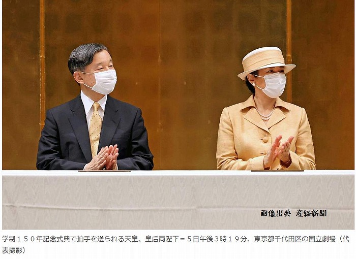 天皇、皇后両陛下は5日、東京都千代田区の国立劇場を訪問し、日本最初の全国規模の近代教育法令である「学制」公布から150年を記念する式典に臨席された。天皇陛下は式典で、教育の場でも情報通信技術(ICT)の活用が進んでいることにご言及。その上で、「時代や社会の変化に対応しつつ、誰一人取り残されず、誰もが自分らしさを大切にしながら学ぶことができ、一人一人の可能性が最大限に引き出される教育の実現に向けた動きが着実に進むことを期待いたします」と述べられた。