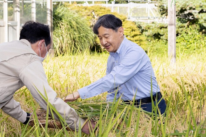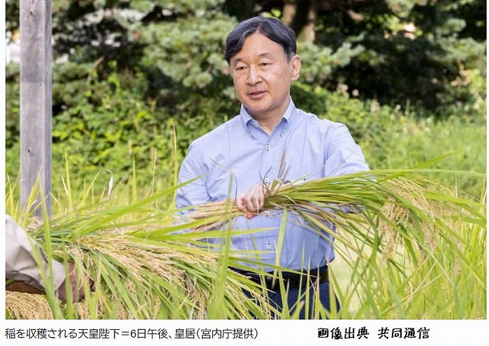 天皇陛下は6日、皇居内の生物学研究所の脇にある田んぼで恒例の稲刈りをされた。長袖シャツに黒い長靴姿の陛下はしゃがみながら、右手に持った鎌で、うるち米のニホンマサリと、もち米のマンゲツモチ計20株を小気味よく刈り取った。皇居での稲作は、農業奨励のために昭和天皇が始めた行事で、陛下は上皇さまから引き継いだ。今年は陛下が4月に種もみをまき、5月に田植えをした。宮内庁によると、天候に恵まれて稲はよく成長し、作柄は平年並みという。収穫したコメは、皇室の神事に使われる。記事・画像出典 共同通信 https://nordot.app/939807223666753536?c=39546741839462401