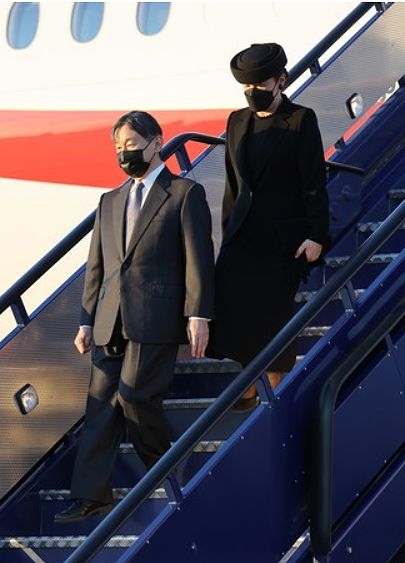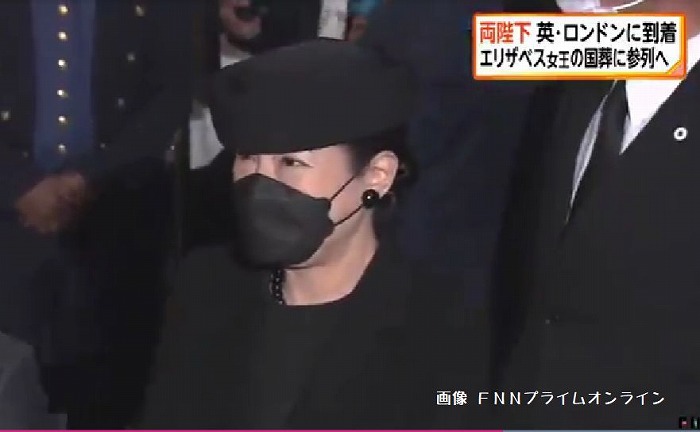 天皇皇后両陛下がイギリス到着しました。羽田空港ではジャケットの背中にシワが寄って見苦しかったのですが、イギリス到着時は着替えをして、黒のワンピースとジャケット、黒の帽子にマスクも黒でした。流石に国葬ではマスク着用はないでしょうねぇ。